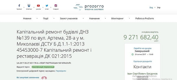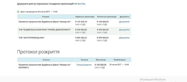 В тендере приняли участие три фирмы, среди которых ООО «Житлорембуд – Ніка», предложившее выполнить работы за 8 миллионов 999 тысяч 900 гривен, ООО «Строительная компания «Прайм Девелопмент» с предложением в 8 миллионов 400 тысяч гривен и ЧП Строительная фирма «Квазар-Инк» со своим предложением в 8 миллионов 100 тысяч гривен.