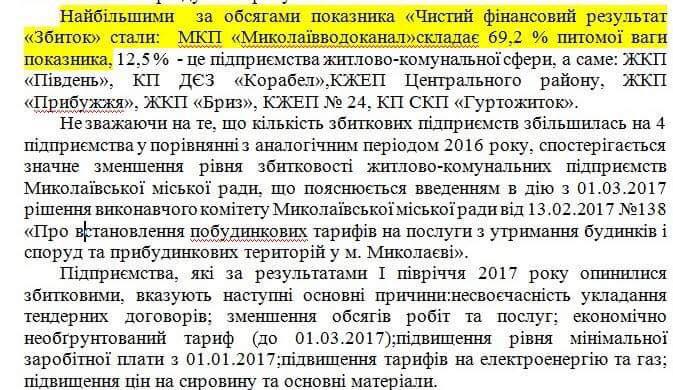Убыточность ГКП «Николаевводоканал» составила 69,2% ! удельного веса показателя «Чистый финансовый результат «Убыток», 12,5% — это предприятия жилищно-коммунальной сферы, а именно: ЖКП «Пивдень», КП ДЕЗ «Корабел», КЖЕП Центрального района, ЖКП «Прибужжя », ЖКП «Бриз», КЖЕП № 24 КП СКП «Гуртожиток», — написал Ентин.