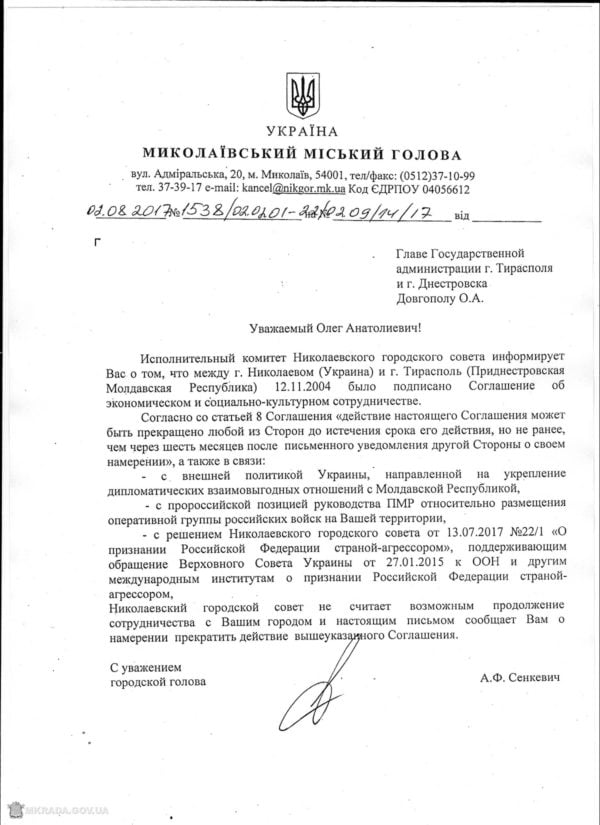 Кроме того, мэр подписал письмо и о прекращении действия соглашения об экономическом и социально-культурном сотрудничестве с городом Тирасполь, столицей непризнанного Приднестровья. Указанные документы были направлены адресатам 2 августа 2017 года.