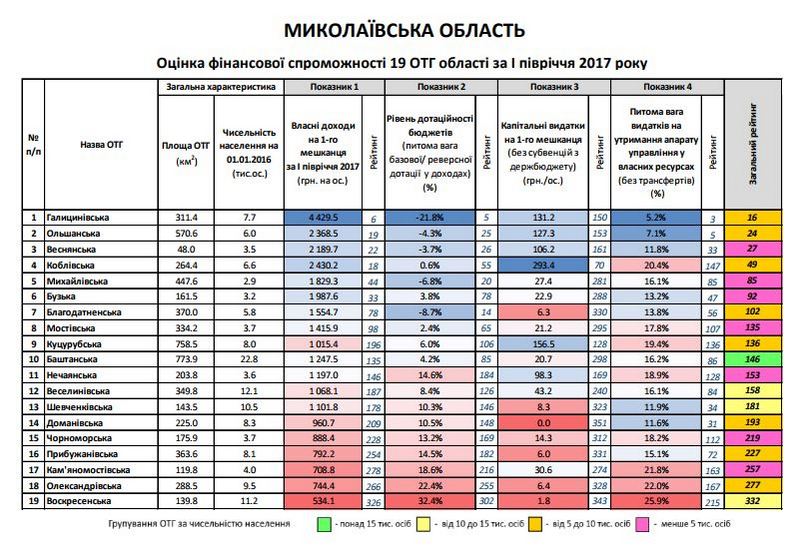 Худшие результаты среди объединенных громад Николаевщины — у Воскресенской и Александровской ОТГ, соответственно 332 и 227 место в Украине.