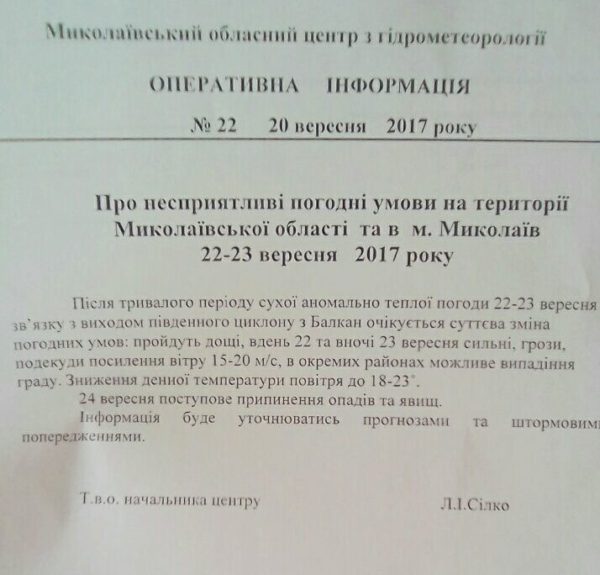 После длительного периода сухой аномально теплой погоды 22-23 сентября в связи с выходом южного циклона с Балкан ожидается существенное изменение погодных условий: пройдут дожди, днем 22 и ночью 23 — сильные, грозы.