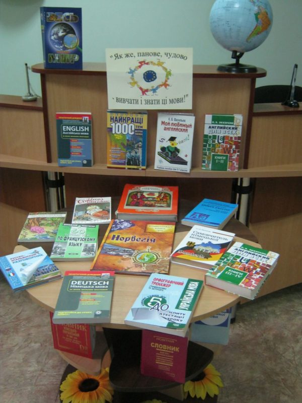 «Як же, панове, чудово – вивчати і знати ці мови» — під такою назвою у відділі довідкових та інформаційних послуг розгорнута книжкова виставка для всіх, хто знає чи прагне вивчати європейські мови. На ній представлено розмаїття підручників, самовчителів, розмовників з англійської, німецької, французької мови та інших мов.