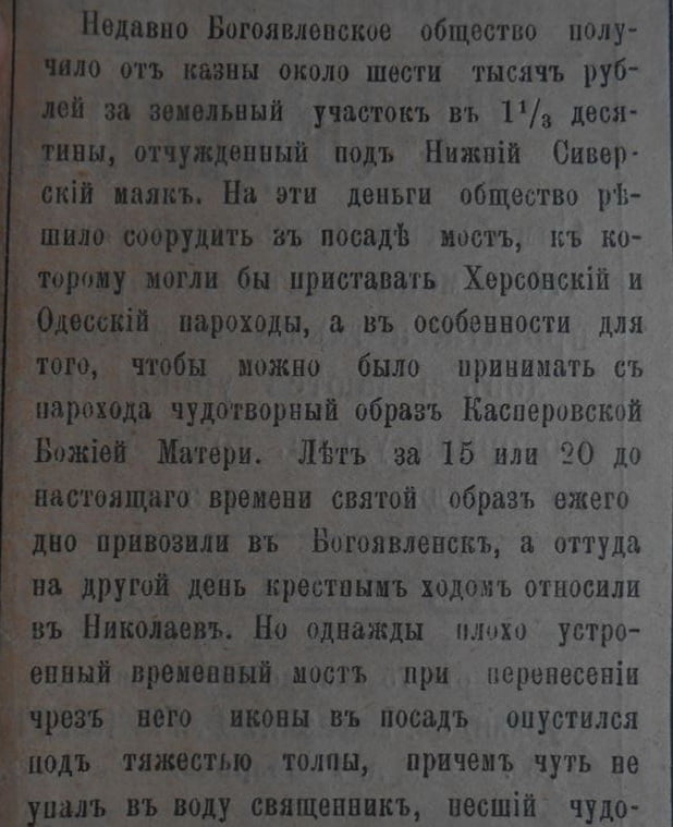 «Недавно Богоявленское общество получило от казны около шести тысяч рублей за земельный участок в 1/3 десятины, отчужденный под Нижний Сиверский маяк. На эти деньги общество решило соорудить в посаде мост, к которому могли бы приставать Херсонский и Одесский пароходы, а в особенности для того, чтобы можно было принимать с парохода чудотворный образ Касперовской Божией Матери.
