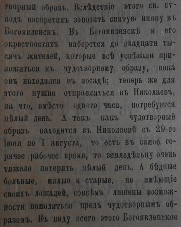 В Богоявленске и его окрестностях наберется до двадцати тысяч жителей, которые все успевали приложиться к чудотворному образу, пока он находился в посаде; теперь же для этого нужно отправляться в Николаев, на что, вместо одного часа, потребуется целый день. А так как чудотворный образ находится в Николаеве с 29-го июня по 1 августа, то есть в самое горячее рабочее время, то земледельцу очень тяжело потерять целый день. А бедные больные, малые и старые, не имеющие своих лошадей, совсем лишены возможности помолиться пред чудотворным образом.
