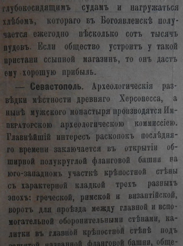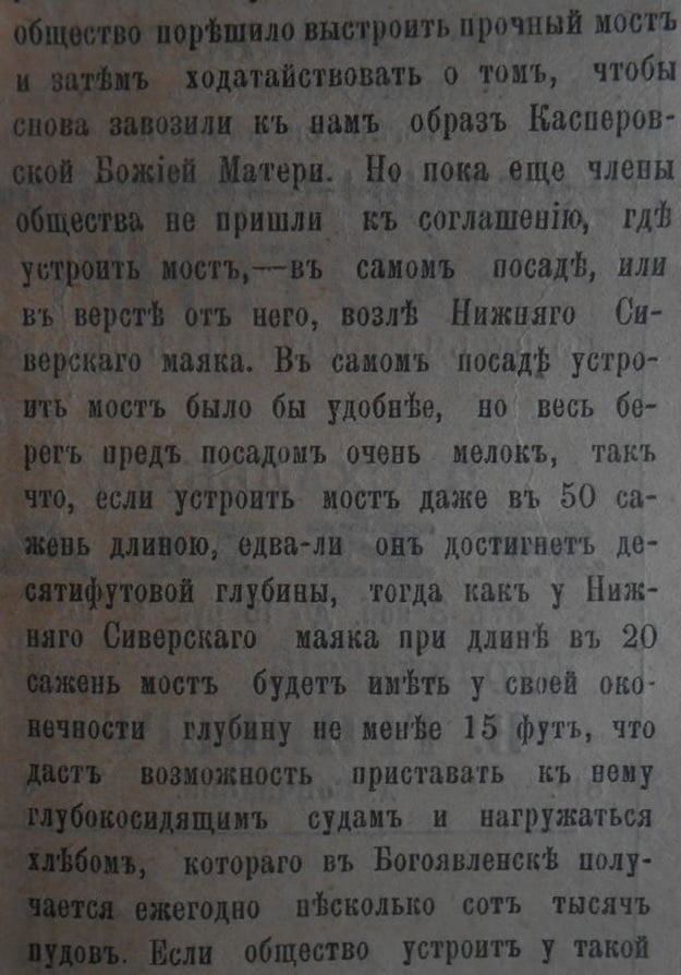 «Но пока еще члены общества не пришли к согласию, где устроить мост, – в самом посаде, или в версте от него, возле Нижняго Сиверскаго маяка. В самом посаде устроить мост было бы удобнее, но весь берег пред посадом очень мелок, так что если устроить мост даже в 50 сажень длиною, едва ли он достигнет десятифутовой глубины, тогда как у Нижняго Сиверскаго маяка при длине в 20 сажень мост будет иметь у своей оконечности глубину не менее 15 фут, что даст возможность приставать к нему глубокосидящим судам и нагружаться хлебом, которого в Богоявленске получается ежегодно несколько сот тысяч пудов. Если общество устроит у такой пристани ссыпной магазин, то он даст ему хорошую прибыль».