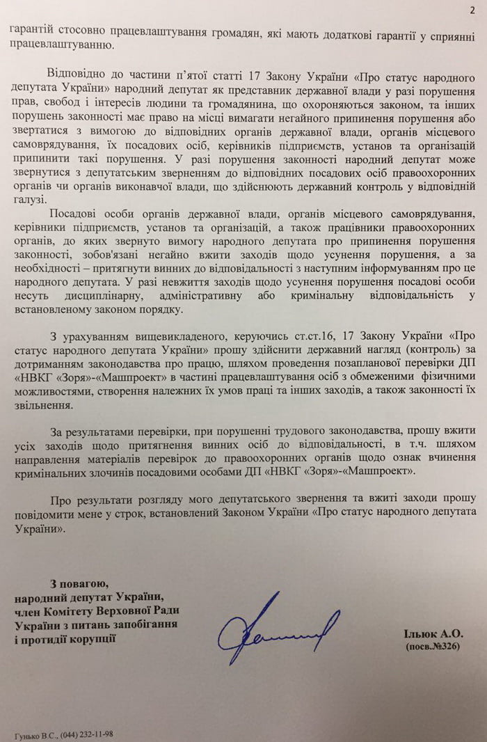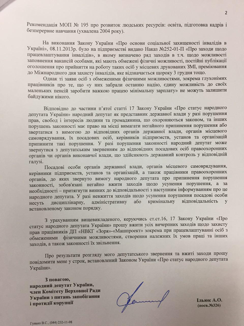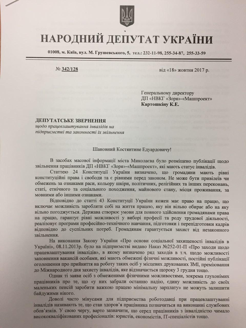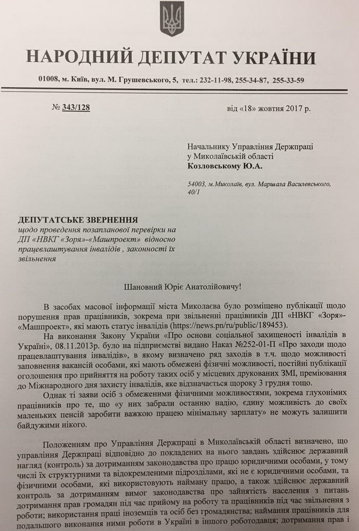 Народный депутат Украины, заместитель руководителя депутатской группы «Партия «Відродження» Артем Ильюк обратился к начальнику управления Гоструда Николаевской области с требованием провести внеплановую проверку ГП «НПКГ «Зоря»-«Машпроект» и разобраться с законностью увольнения инвалидов.