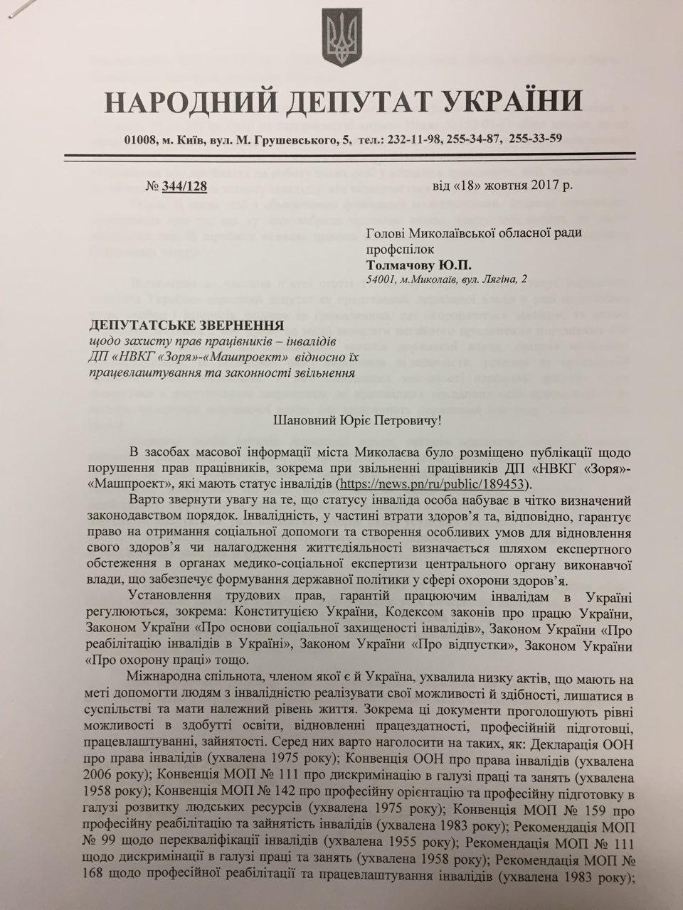 Кроме того, николаевский нардеп попросил председателя Николаевского областного совета профсоюзов принять все исчерпывающие меры по защите прав уволенных работников «Зори».