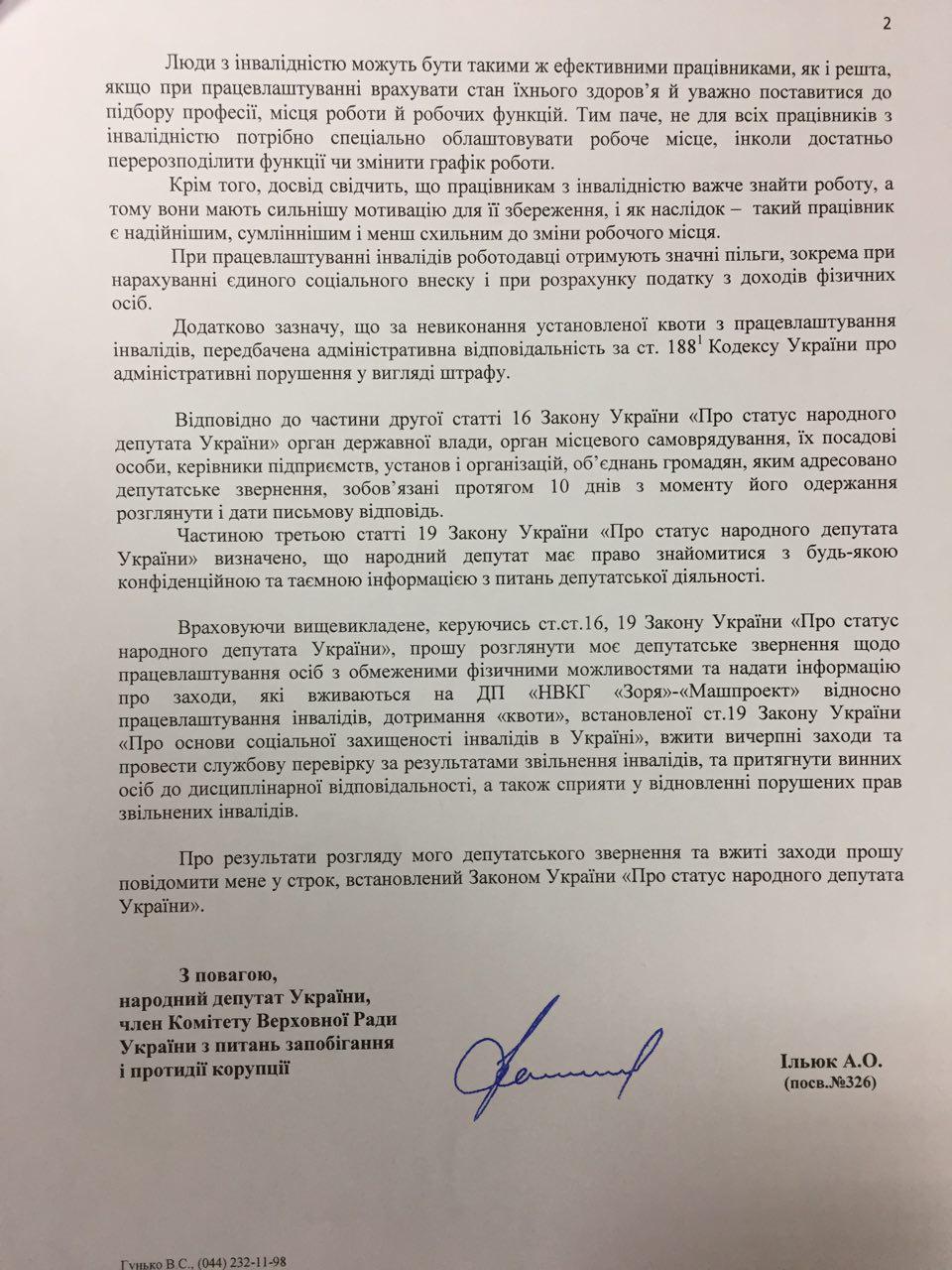 Также Артем Ильюк направил обращение гендиректору государственного предприятия «НПКГ «Зоря»-«Машпроект» Константину Картошкину с тем, чтобы он инициировал на предприятии служебную проверку по результатам увольнения инвалидов, и привлек виновных лиц к дисциплинарной ответственности, а также содействовал в восстановлении нарушенных прав уволенных инвалидов.