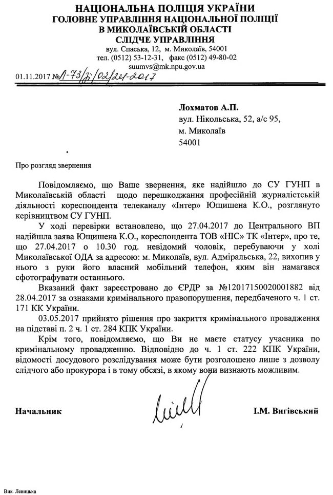 Центральный районный отдел полиции Николаева закрыл уголовное производство по факту препятствования законной профессиональной деятельности журналиста телеканала «Интер» Кирилла Ющишена через неделю после того, как его открыла.