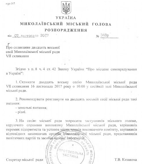 Согласно распоряжению Николаевского городского головы № 348р от 7 ноября 2017 г., подписанному исполняющей обязанности мэра города Николаева, секретарем горсовета Татьяной Казаковой, 28-я сессия Николаевского горсовета седьмого созыва состоится 16 ноября. Начало пленарного заседания назначено на 10:00.