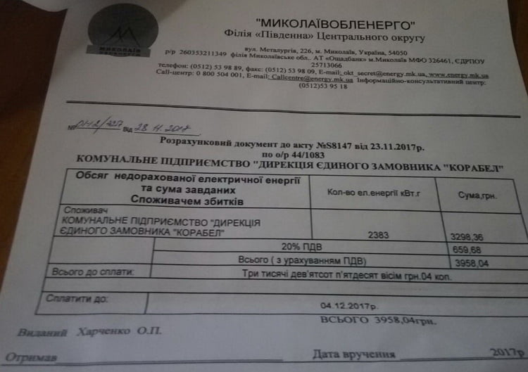 Отметим, что в расчетном документе к акту, составленному сотрудником филиала «Южный» ПАО «Николаевоблэнерго», потребителем, причинившем предприятию убытки на сумму 3 958,04 грн. из-за «недосчитанной электроэнергии» в количестве 2 383 кВт, является непосредственно КП «ДЕЗ «Корабел».