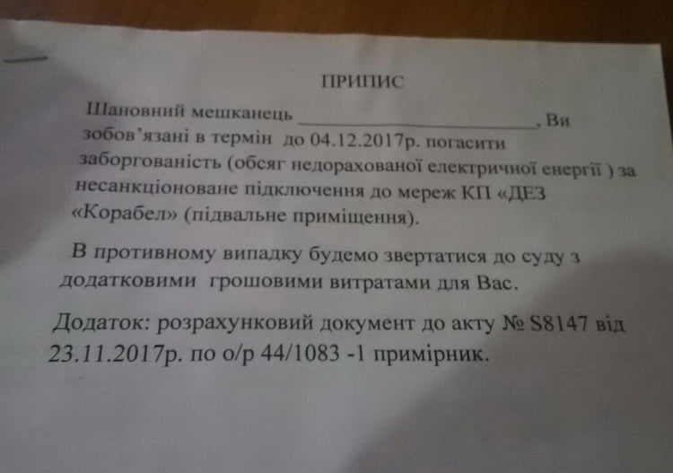 Сегодня, 28.11.17 в дверях всех квартир появились бумаги, фото которых я прикрепляю к этому обращению. На этих бумагах сказано, что каждая квартира должна уплатить штраф в размере 3958,04 грн до 4.12.2017. В противном случае, на нас будут подавать в суд, что повлечет «дополнительные денежные растраты для Нас», — написал Валерий в редакцию «Корабелов.Инфо».