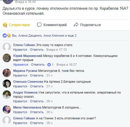 Сотрудники круглосуточного реагирования оперативной службы горисполкома, куда удалось дозвониться жителям, сегодня после обеда удивлялись, услышав, что где-то еще нет отопления. Мол, «мы знаем, что в Корабельном была авария, но всё уже должны были запустить»… А дежурные слесаря из ЖЭКа рассказали, что у них сегодня было более 100 заявок-жалоб на отсутствие теплоснабжения.