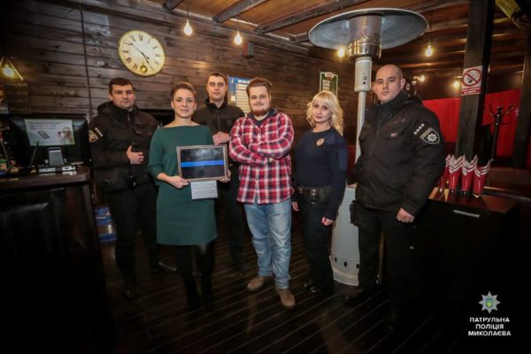 Начальник вручив працівникам ресторану символ руху, якому одразу знайшли його почесне місце. Сподіваємось, що «ТонкаСиняЛінія» у даному закладі — це тільки початок розвитку цього руху в нашому місті. Така підтримка надихає та надає сили та віри, що разом ми зможемо змінити наше місто на краще! — повідомляє Патрульна поліція Миколаєва.