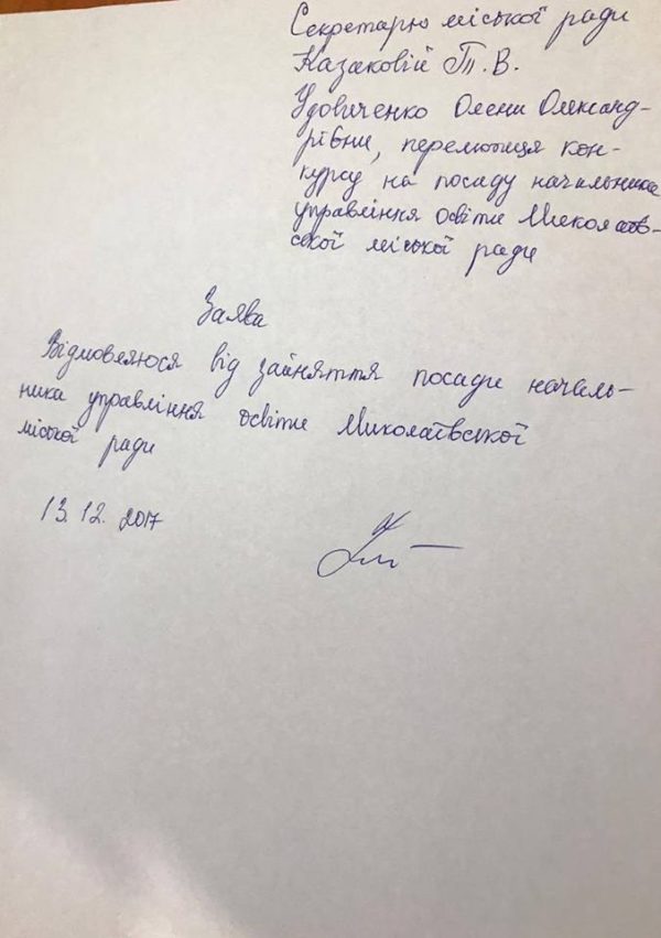 Переможниця конкурсу на посаду начальника управління освіти ММР Олена Удовиченко написала заяву-відмову від зайняття вищезазначеної посади.