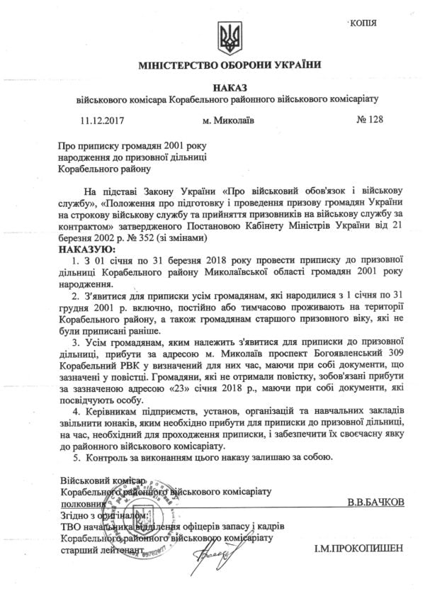 Відповідно до статей 1, 14 Закону України «Про військовий обов’язок і військову службу” та статей 2, 27 Закону України «Про місцеві державні адміністрації”, у січні–березні 2018 року в Корабельному районі буде проводитись приписка громадян України 2001 року народження до призовної дільниці Корабельного району міста Миколаєва.