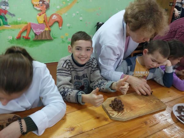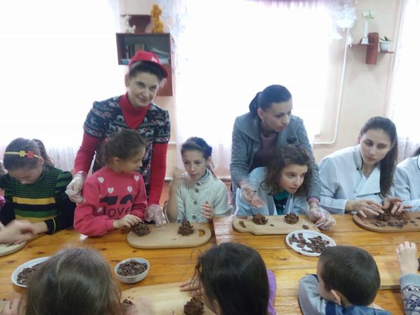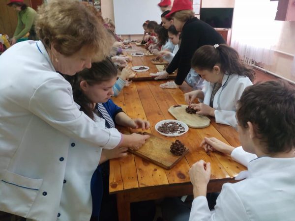 Учасники благодійного марафону «Верим в чудо! Творим чудо!» — бібліотекарі Бібліотеки для дітей №8 міста Миколаєва — команда під назвою «Бібліоледі» провели кулінарний майстер-клас «Зимние вкусняшки» для вихованців Інтернату №6 для слабочуючих дітей. Виготовляли ялинкові шишки. Діти старанно виліпляли пірамідки з солодкого тіста, потім прикріпляли ряд за рядом шоколадні хлоп’я, завершальний етап — притрусити цукровою пудрою готовий смаколик. Шишки вийшли насправді зимові, неначе їх притрусило снігом у зимовому лісі.