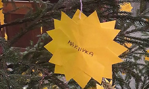 В Чехии новогоднюю елку нарядили в цвета украинского флага, украсив самодельными игрушками с названиями оккупированных городов Донбасса.