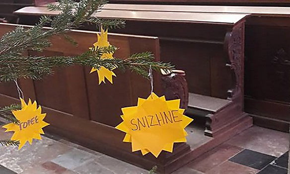 В Чехии новогоднюю елку нарядили в цвета украинского флага, украсив самодельными игрушками с названиями оккупированных городов Донбасса.