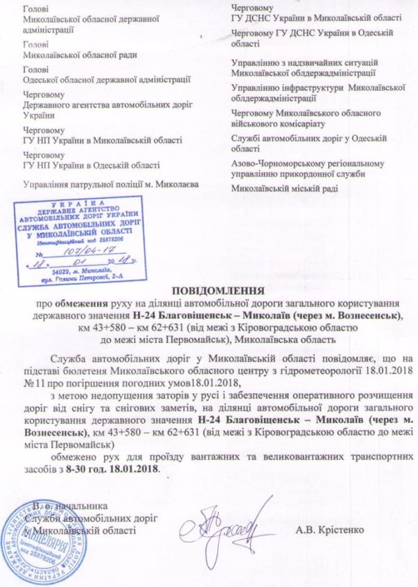 В связи с осложнениями движения на участке автомобильной дороги М-05 Киев-Одесса (в пределах Черкасской области) с 08:30 18 января 2018 г. введено временное ограничение движения грузовых автотранспортных средств на участке автомобильной дороги Н-24 Благовещенское — Николаев (через г. Вознесенск), км 43 580 — км 62 + 631 (от границы с Кировоградской областью до города Первомайск).