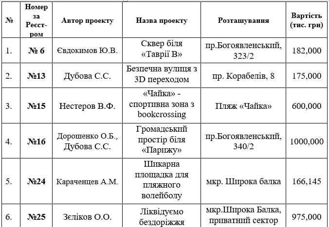 Повний перелік (список) проектів, які отримали позитивну оцінку за результатами розгляду експертною групою з питань Громадського бюджету м. Миколаєва та допущені до відкритого голосування, можна побачити ТУТ.