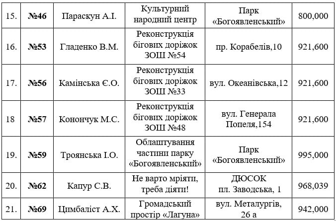 Заступник голови райадміністрації Алла Луцька надала список проектів, які стосуються Корабельного району та пройшли експертну раду, отримавши нову номерацію: