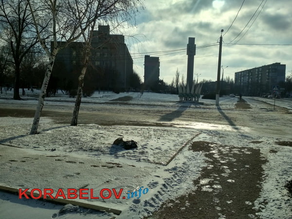 Совсем не чищенными оказалась и площадь за остановкой «Универсам» (возле памятного знака «Героям, павшим во славу Отчизны»), и пешеходная площадка возле магазина «Валентина» (с другой стороны проспекта).