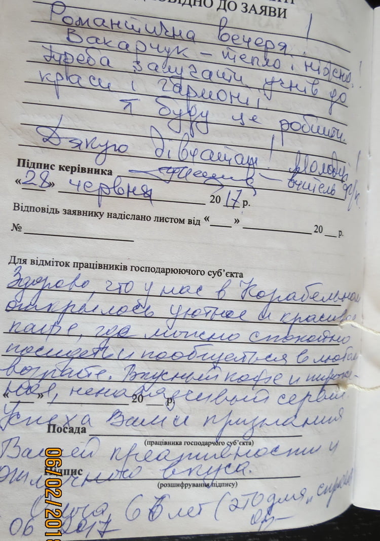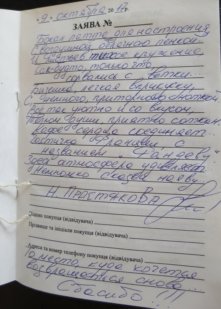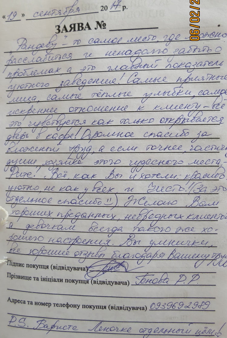 «Рита! Большое спасибо за возможность прекрасного рандеву в твоем Рандеву! Ещё в Киеве узнала об открытии кафе и, приехав в этот раз на один день в Николаев, зашла. Всё отлично: интерьер, кофе, пирожное, обслуживание, атмосфера уюта. Желаю дальнейшего процветания!» (Наталья Викторовна, 05.07.17).