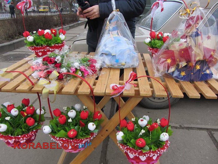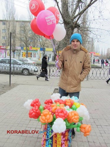 Достаточно милым и при этом наиболее доступным презентом оказались цветочки из воздушных шаров по 15 гривен за штуку, а также воздушные шары с оригинальными пожеланиями — по 25 гривен.