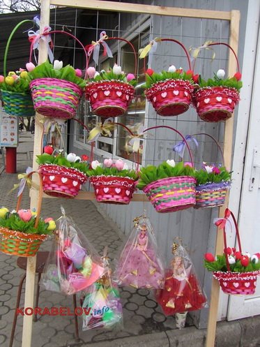 Для наиболее романтичных покупателей предлагают корзинки и куклы с конфетами. Стоимость этой красоты — 150 гривен.