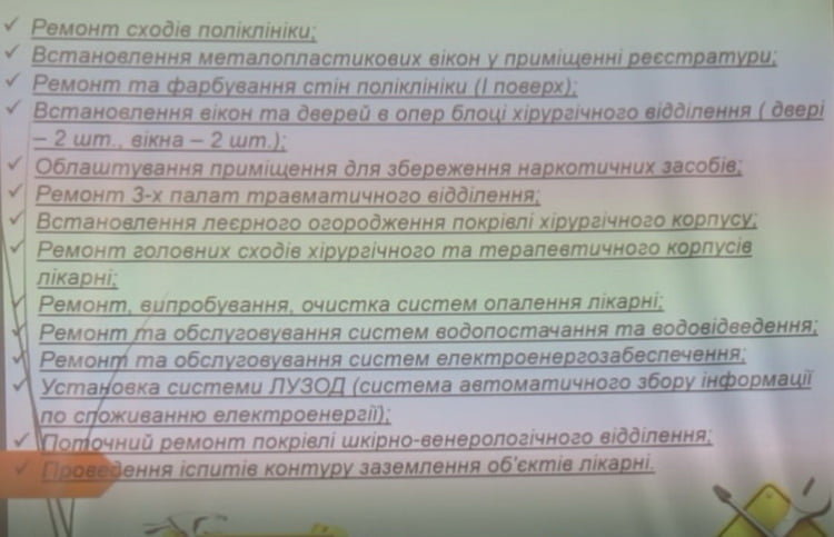 Протягом року наша госпслужба працювала над виконанням проведення поточних ремонтів. Я закцентуюсь на декількох нюансах. Зроблено ремонт силою господарських служб — це ремонт в операційній нашій хірургічній (з надходження коштів благодійних — закупівля матеріалів, а руки — повністю нашої господарської служби). В пологовому відділені проведено щорічний ремонт: господарська служба разом з колективом пологового відділення (люди виходили на роботу і допомагали) спільними зусиллями. Мені уже сказали «Дякую» за те, що відремонтували поріг терапевтичного відділення (з другої сторони корпусу), який знаходився в аварійному стані, це теж дуже велика робота, також за благодійні кошти закупили матеріали, а співробітники зробили все це самі (встановлення огорожі та укладка тротуарної плитки.