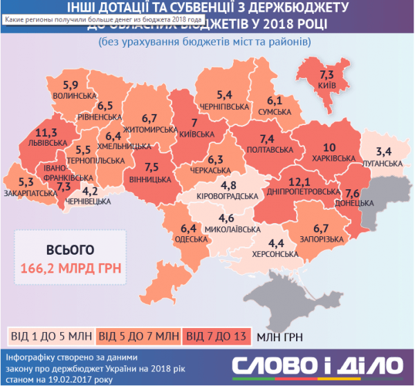 Больше всего денег на «другое» получат Днепропетровская, Харьковская и Львовская области, а меньше всего из госбюджета выделено на Луганскую, Херсонскую, Николаевскую и Кировоградскую области.