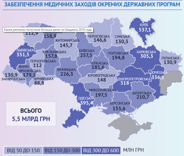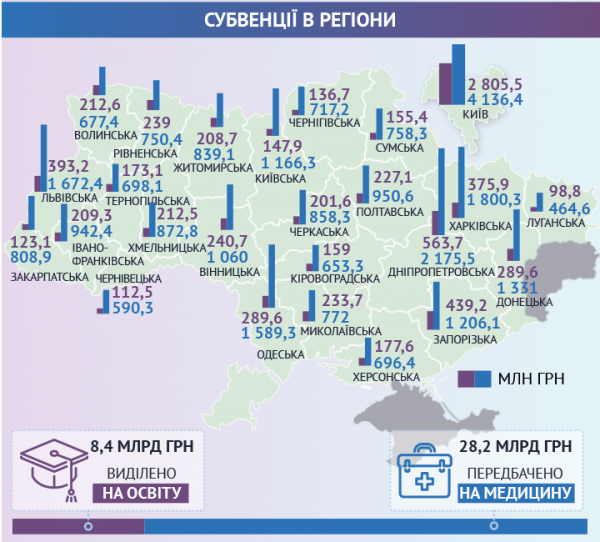 На медицину в 2018 году регионы получат 28 млрд 187 млн. Больше всего денег пойдет в Киев и область, а также в Днепропетровскую, Харьковскую, Львовскую и Донецкую области, а меньше всего – в Черновицкую, Волынскую, Черниговскую и Луганскую области.