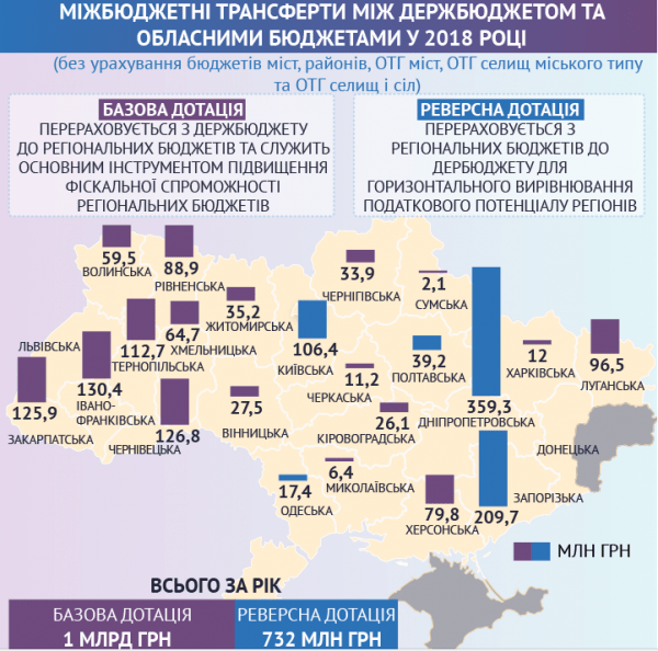 Перевод средств (трансферт) из госбюджета в областные бюджеты в 2018 году предусматривает 1 млрд 39,5 млн грн базовой дотации и 732 млн грн реверсной дотации. Базовая и реверсная дотации – это два денежных потока, противоположных по направлению движения, между государственным и местными бюджетами.