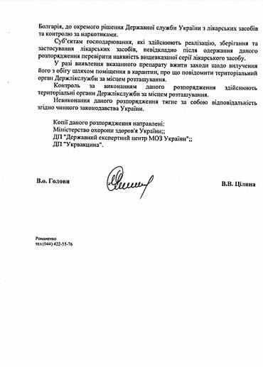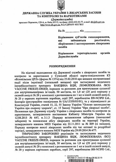Сообщается, что причиной запрета является сообщение от Белопольской районной больницы (Сумская область) о том, что после иммунизации умер ребенок.