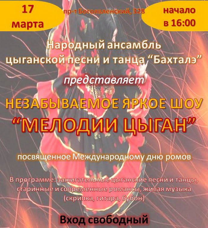 17 марта в 16:00  в концертном зале Николаевского городского дворца культуры «Корабельный» (проспект Богоявленский, 328) состоится праздничный концерт, посвященный Международному дню ромов.