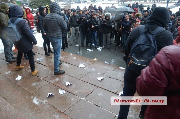 Участники митинга держали в руках листы с надписями «Отставка Савченко» и пускали в толпу самолетики из бумаги. Позднее этими листами и самолетиками обклеили дверь в здание ОГА.