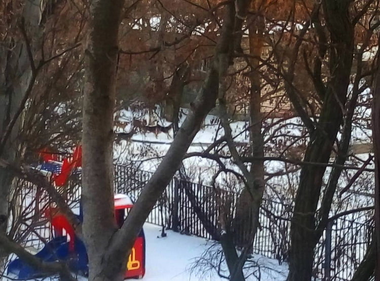 «Стадо, що довелося оминати в районі проспекту Корабелів, 12-б. Голодна і замерзла зграя, що по дворі гасає у пошуках пожерти і скубеться між собою за знайдені дрібниці, лякає мене і дитину навіть без прямого кидання на мене. В бік за кілька метрів — дитячий майданчик, в другий бік — під’їзд будинку, зграя посеред дороги, і обходь, як хочеш. :(«