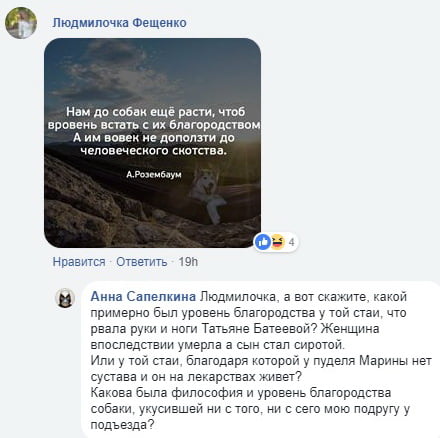 Тем не менее, очень многие уже не в силах терпеть сложившуюся в городе ситуацию с бродячими псами. Так, Инна С. пишет: