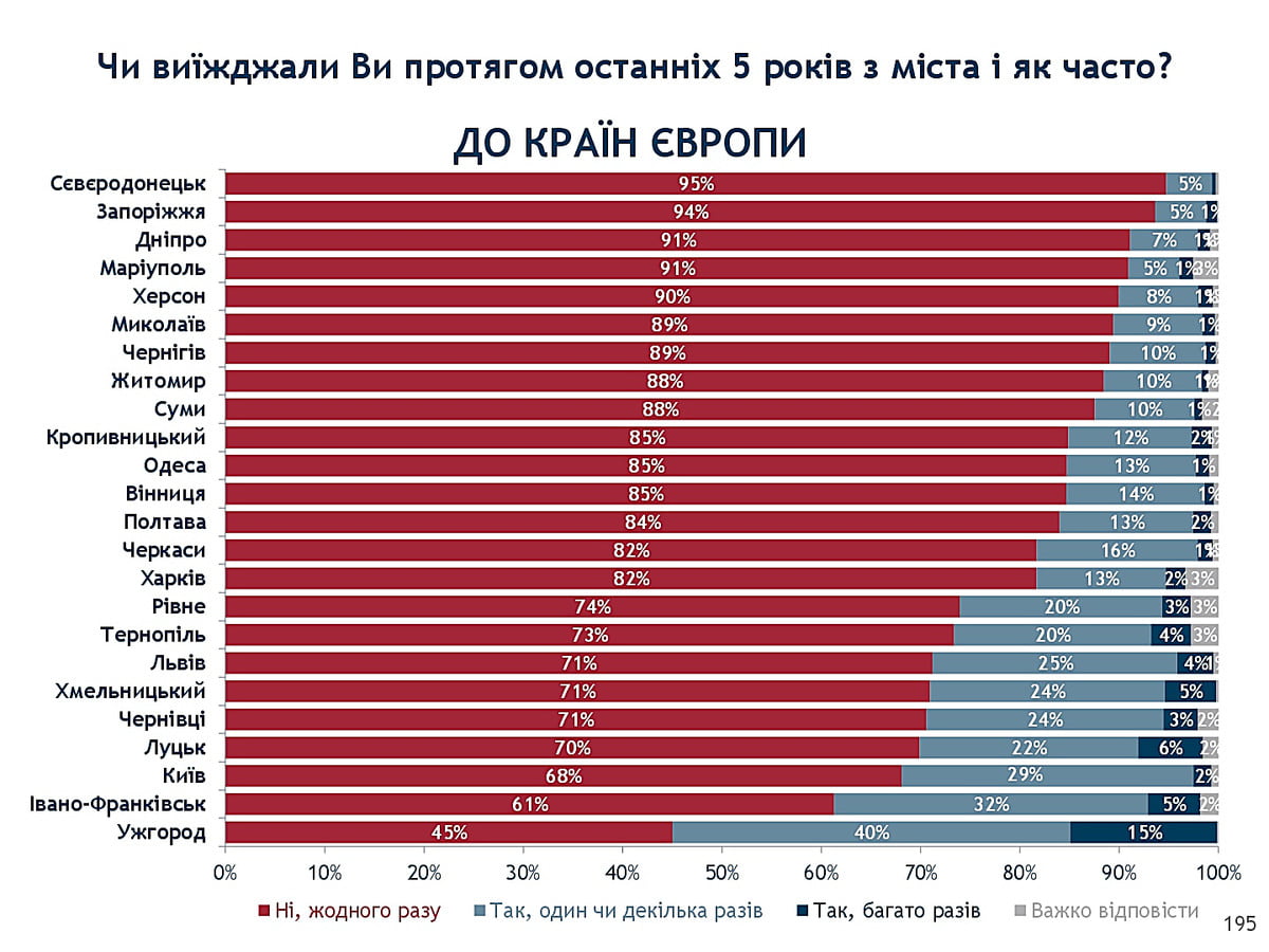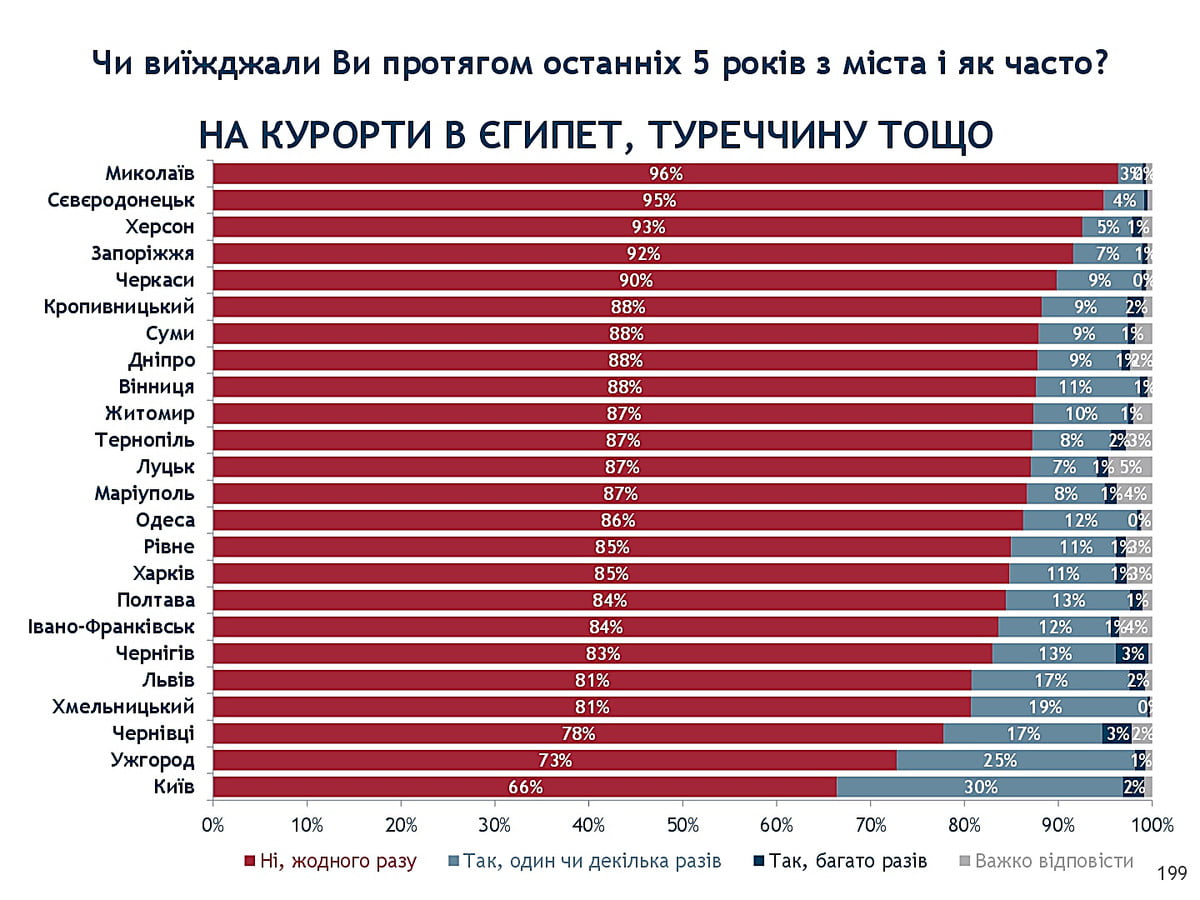 К примеру, в странах Европы не бывали 89% николаевцев. А 90% николаевцев не бывали за пять лет в странах СНГ. Худший показатель по Украине у николаевцев с поездками на курорты в Египет или Турцию – там бывали всего 4% горожан. Также отметим, что 52% николаевцев за последние пять лет не выезжали в другой регион Украины.