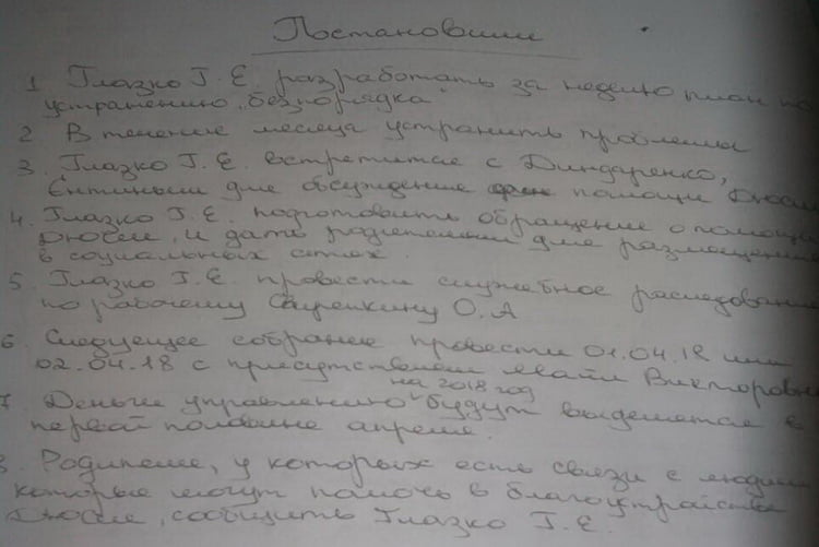 Дети фотографировали на тренировках, как при сотруднике школы Олега грузилось что-то в машину, и при этом дети говорят: «этому дяде давали вот такой пресс бабок». Дети приходят домой и говорят, что с этого стадиона вывозят все! Приезжал кран (дети тоже видели), грузились плиты и вывозились в неизвестном направлении… А после первого нашего собрания приходит ко мне на роботу этот Олег, который вывозил все, приходит в нетрезвом состоянии (и пришел именно ко мне, при этом он не знает мою фамилию; кто ему сказал, что на первом собрании поднимала вопросы именно я, — не знаю). И говорит: «Слышь, ты, пошли выйдем, поговорить надо». Возле меня стояли мужчины, и он ушел. На следующий день он стоял возле моего рабочего места, но я шла с работы не одна… Два дня подряд он меня ждал перед работой», — рассказала Людмила Зайчук.
