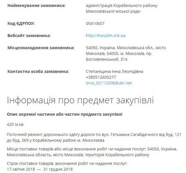 Отметим: договор на поточный ремонт 420 кв. метров дороги по ул. Гетмана Сагайдачного (от дома № 121 до дома № 269) администрация Корабельного района (опять без тендера) заключила 17 апреля 2018 года с ФЛП Стеценко Александр Николаевич на сумму 195 463, 33 грн.