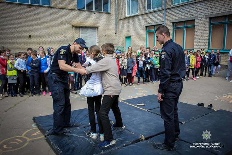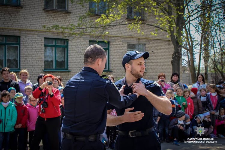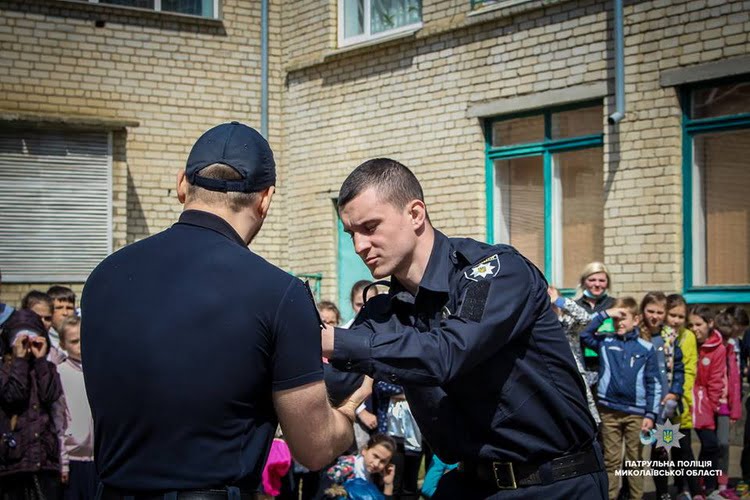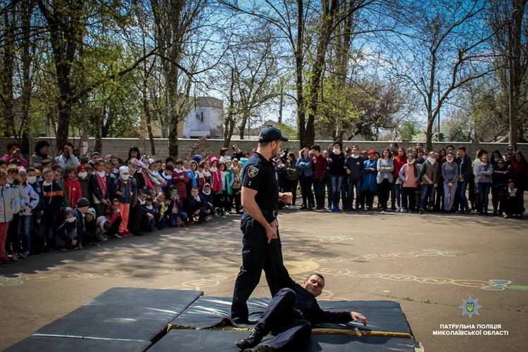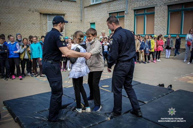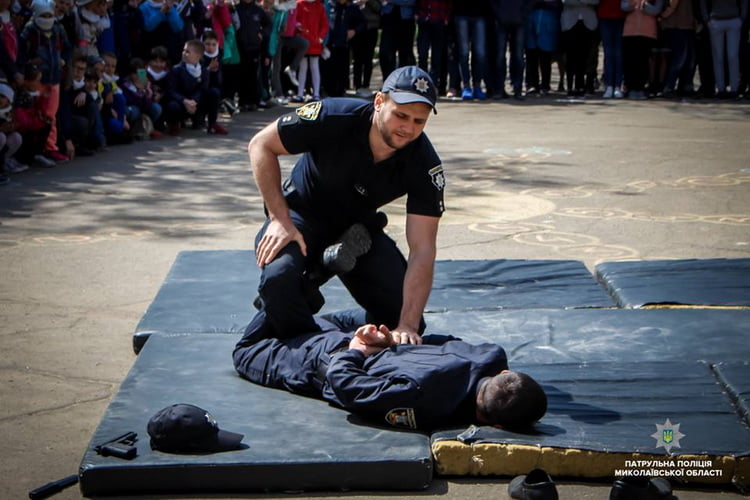 На подвір’ї навчального закладу інструктори з тактичної підготовки Управління патрульної поліції в Миколаївській області провели дітям показове заняття з самооборони.