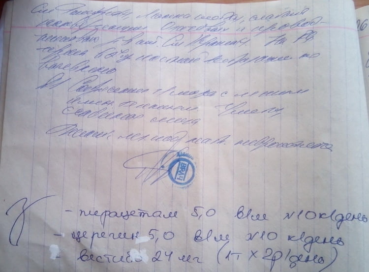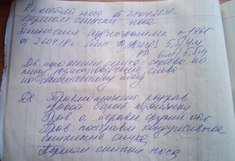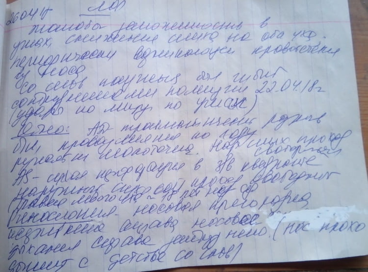 На следующий день, 23 апреля, мне было очень плохо, болела голова, болел нос. Я пошёл в нашу больницу (ЖЦРБ), мне там диагностировали перелом спинки носа, сотрясение головного мозга, повреждение мягких тканей лица (множественные ушибы, ссадины, гематомы), ушиб правого коленного сустава, ушиб пояснично-крестцового отдела позвоночника, нарушен вестибулярный аппарат, треснуты обе перепонки, и что я теряю слух, и что мне надо теперь делать капельницу каждые полгода, прописали курс лечения», — рассказал Анатолий, подтвердив свои слова медицинскими документами: