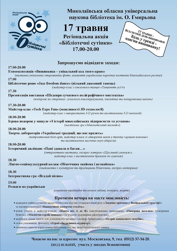 В четверг, 17 мая, в Николаевской областной универсальной научной библиотеке имени А. Гмырёва (ул. Московская, 9) состоится региональная акция «Библиотечные сумерки».
