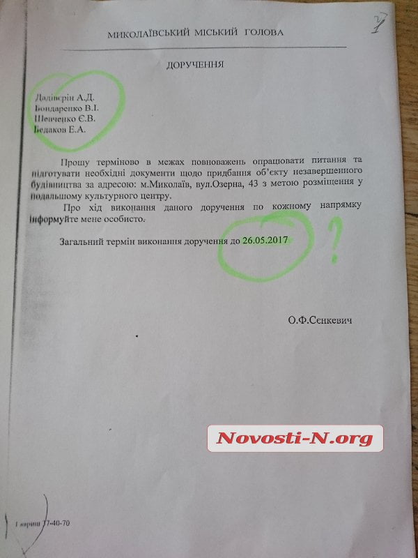 Поручение Сенкевича о приобретении недостроя от 16 мая также «улетело» на первого заместителя городского головы Дадиверина, директора департамента финансов Бондаренко, вице-мэра Шевченко, управделами Степаненко, начальника УКСа Бедакова.