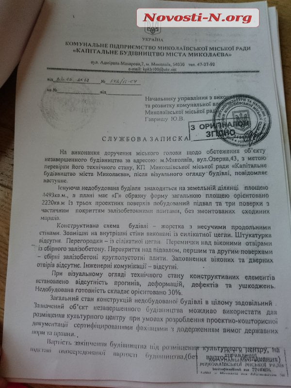Он сообщает, что «во исполнение поручения городского головы по поводу обследования недостроенного здания», выехал на место и осуществил «визуальное обследование».