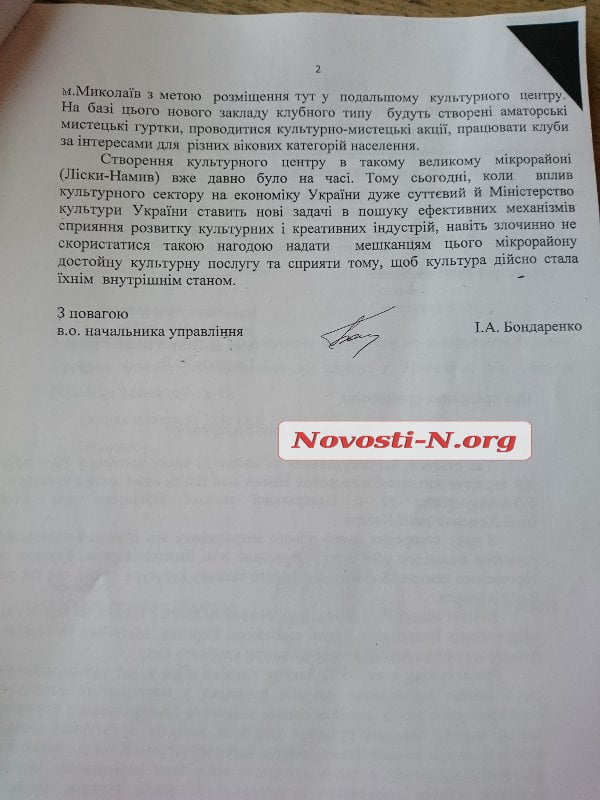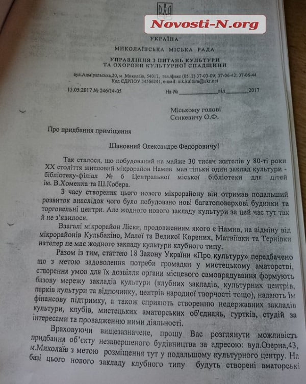 15 мая 2017 года и.о. начальника управления по вопросам культуры и охраны культурного наследия Ирина Бондаренко подписала два идентичные обращения. В них она почему-то вдруг решила вступиться за жителей Намыва, которые много лет маются, бедняги, без собственного дворца культуры. Бондаренко тут же предложила и вариант «решения проблемы» — купить недострой по ул. Озерной, 43. И.о. начальника «городской культуры» не жалея красок живописала, как заживут жители Намыва после того, как объект достроят: будут открыты любительские кружки, желающие смогут заниматься творчеством и т. д. Тут возникают сразу несколько вопросов. Откуда она узнала о том, что жители микрорайона хотят именно Дом культуры с кружками вышивания, а не, например, библиотеку или кинотеатр? С чего она взяла, что под будущий дворец нужно купить именно недострой, а не построить новое здание? Откуда вообще Ирина Анатольевна узнала, что объект на ул. Озерной продается?