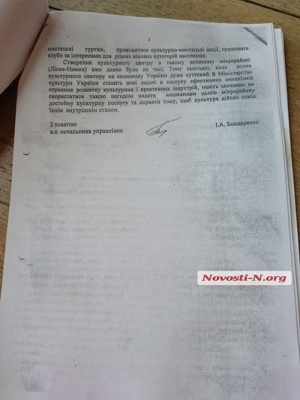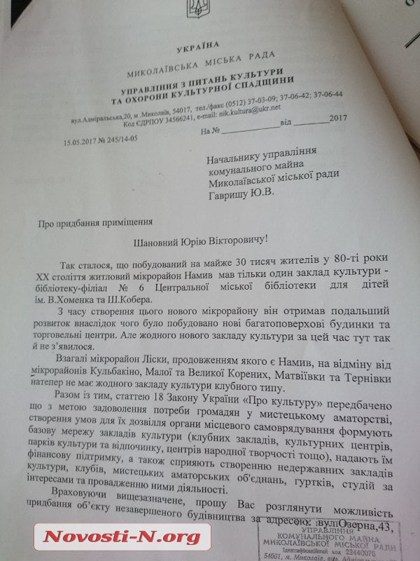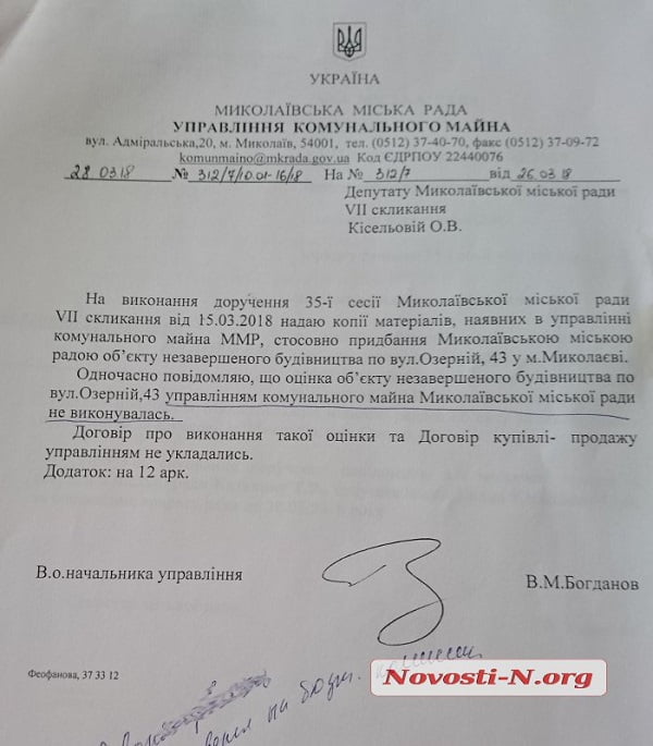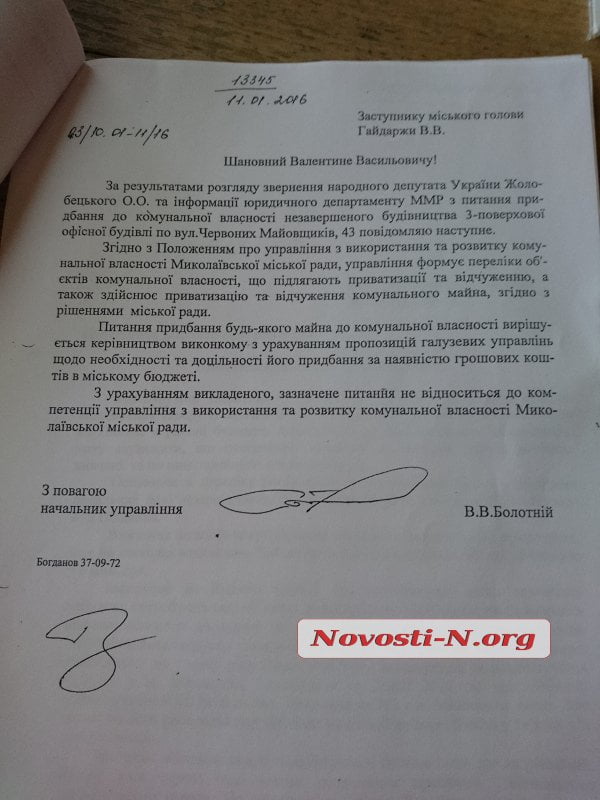 А «назидательно-поучительное» письмо Сенкевича было подкреплено ответом из управления коммунальной собственности, подписанным тогдашним его руководителем Виталием Болотним. Чтоб наверняка убедить нардепа, что приобрести здание в коммунальную собственность не представляется возможным, чиновник сообщил, что управление коммунальной собственности Николаевского городского совета в принципе не имеет полномочий для того, чтобы приобретать или даже инициировать приобретение объектов недвижимости в коммунальную собственность.