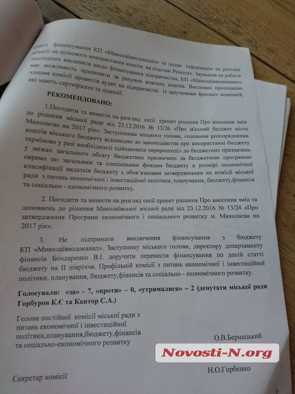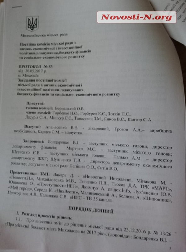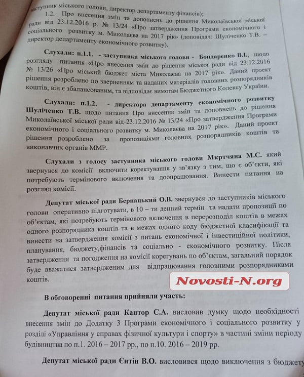«Еще раз хронология. 15 мая у нас уже все было готово к покупке — Гавриш обращается в департамент финансов, называет объект и цену. 16 мая к нам только обращается впервые продавец, который предлагает купить недострой. С 16 мая до 24 мая вопрос был «вылизан», согласован всеми службами и вынесен на рассмотрение комиссии. 30 мая вопрос повторно докладывается вместе со всеми изменениями в бюджет, и никого не настораживает, что комиссия в первый раз сделку не согласовала, и вообще с документами творится черт-те что, 31 мая проект решения вынесен на сессию и проголосован — все стройными рядами на внеочередной сессии проголосовали. Таким образом, в мае 2017 года, в результате заговора или просто договоренности, 11,3 миллиона гривен были выведены из бюджета города Николаева на покупку объекта, как техническое, так и юридическое состояние вызывает дискуссию», — подводит итог изучения документов Елена Киселева.